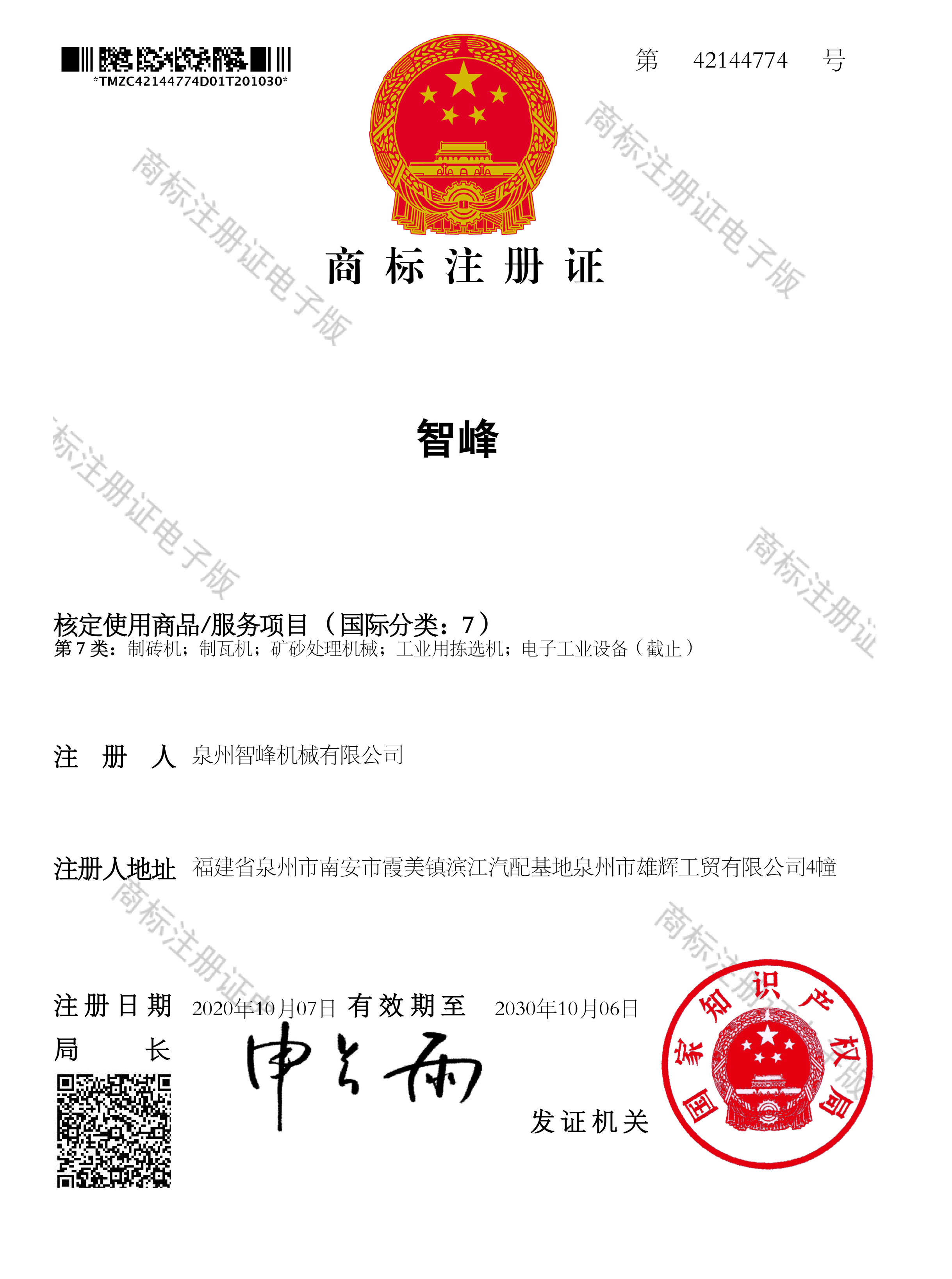 智峰商標(biāo)證書